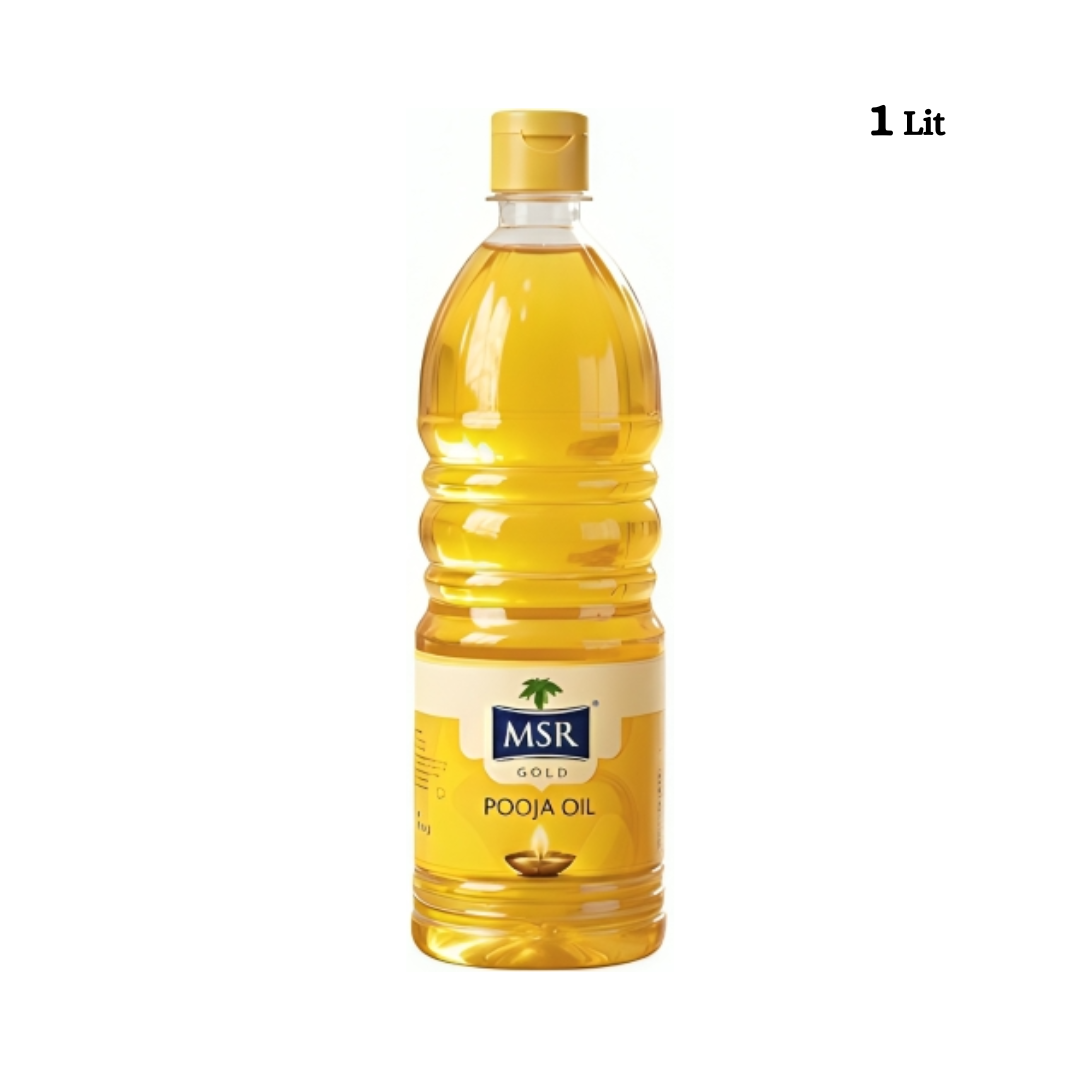 MSR Pooja Oil is a carefully crafted sacred blend of high-quality Neem Oil, Coconut Oil, Sesame Oil, Refined Castor Oil, and Rice Bran Oil, made specially for all devotional rituals. Its clean burn, bright flame, and pleasant natural aroma create a divine and peaceful atmosphere in your home or temple.